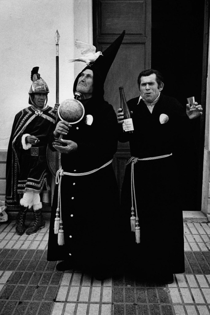 Garcia Rodero retrata una realidad que podría ser la de hace un siglo, pero no. No hay aquí ni autoridad eclesiástica, ni guardia civil, todo lo que nos relata esta foto tiene que ver con un jolgorio procesional más próximo al esperpento que a la fe religiosa, o si se prefiere a un singular auto sacramental, con un romano y dos nazarenos, en los que Dionisos se ha colado de rondón.