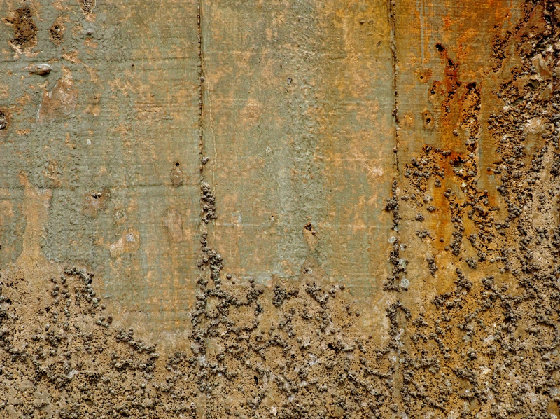 Grises verdosos y ocres reciben vida intermareal. JB, 2024. Óxido y esmalte sobre hormigón y balanos. 42 x 55 cms. Muelle don Luis de Castro Urdiales.