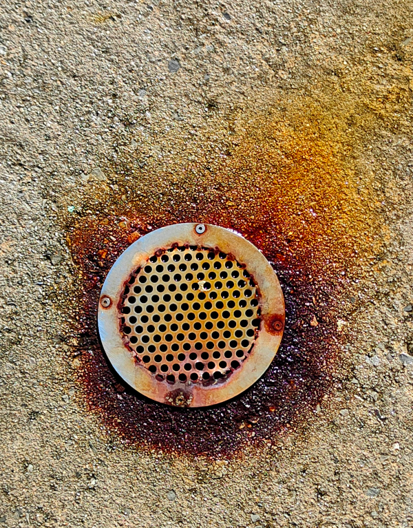 Sumidero de tonos óxidos. JB, 2024. Óxido sobre hormigón y acero inoxidable. 60 x 45 cms. Muelle don Luis de Castro Urdiales.